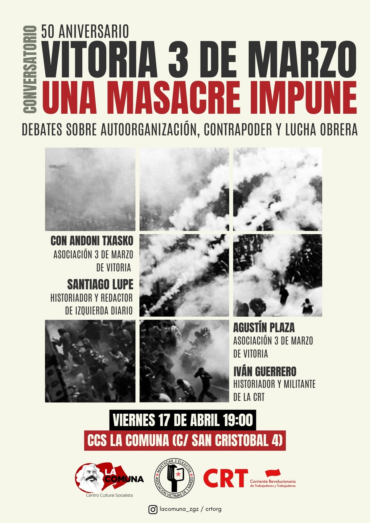 Acto en @lacomuna_zgz el 17 de abril a las 19h con participantes de Vitoria-Gasteiz, de la asociación víctimas del 3 de marzo @martxoak3elkartea, y los historiadores y militantes de la CRT Iván Guerrero y Santiago Lupe, director de @izquierdadiario.es