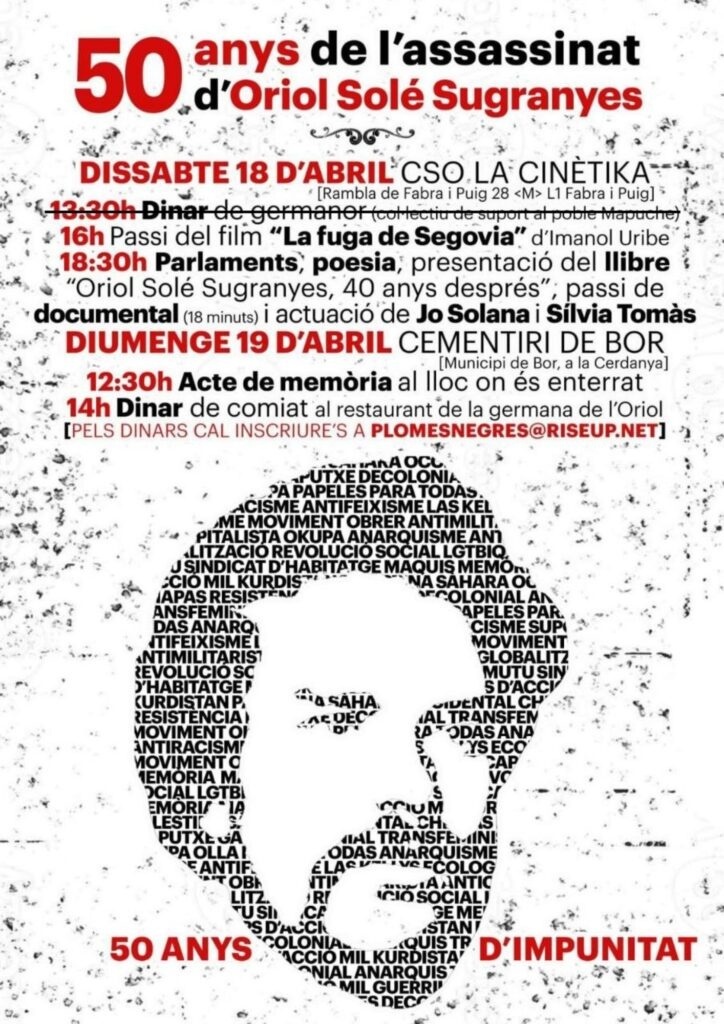 18:30h: actes centrals, que inclouran parlaments, poesia i una breu presentació del llibre «Oriol Solé Sugranyes, 40 anys després», de l’historiador llibertari Ricard de Vargas Golarons.