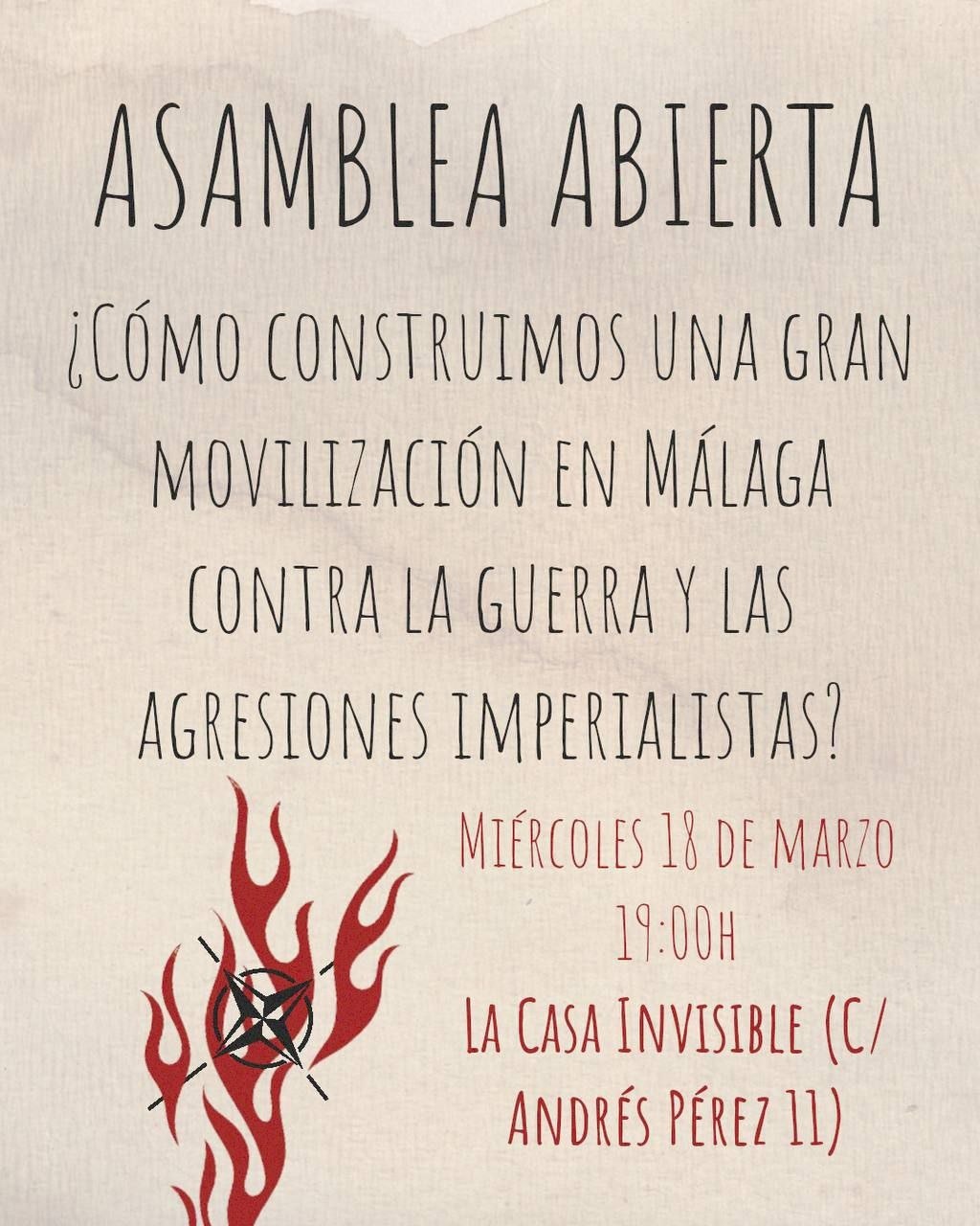 Llamamos a todos y todas las compañeras y organizaciones a participar para organizar una movilización contra la guerra en Málaga, a la vista del recrudecimiento de la situación internacional.