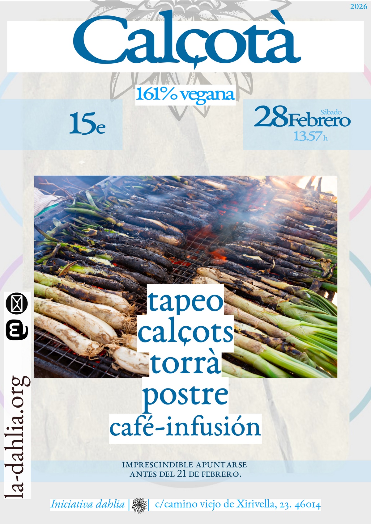 El día 28 nos reuniremos rodeades de humo y vocerío a disfrutar de una copiosa comida vegana: tapeo, calçots, torrà, postre y café/infusión.