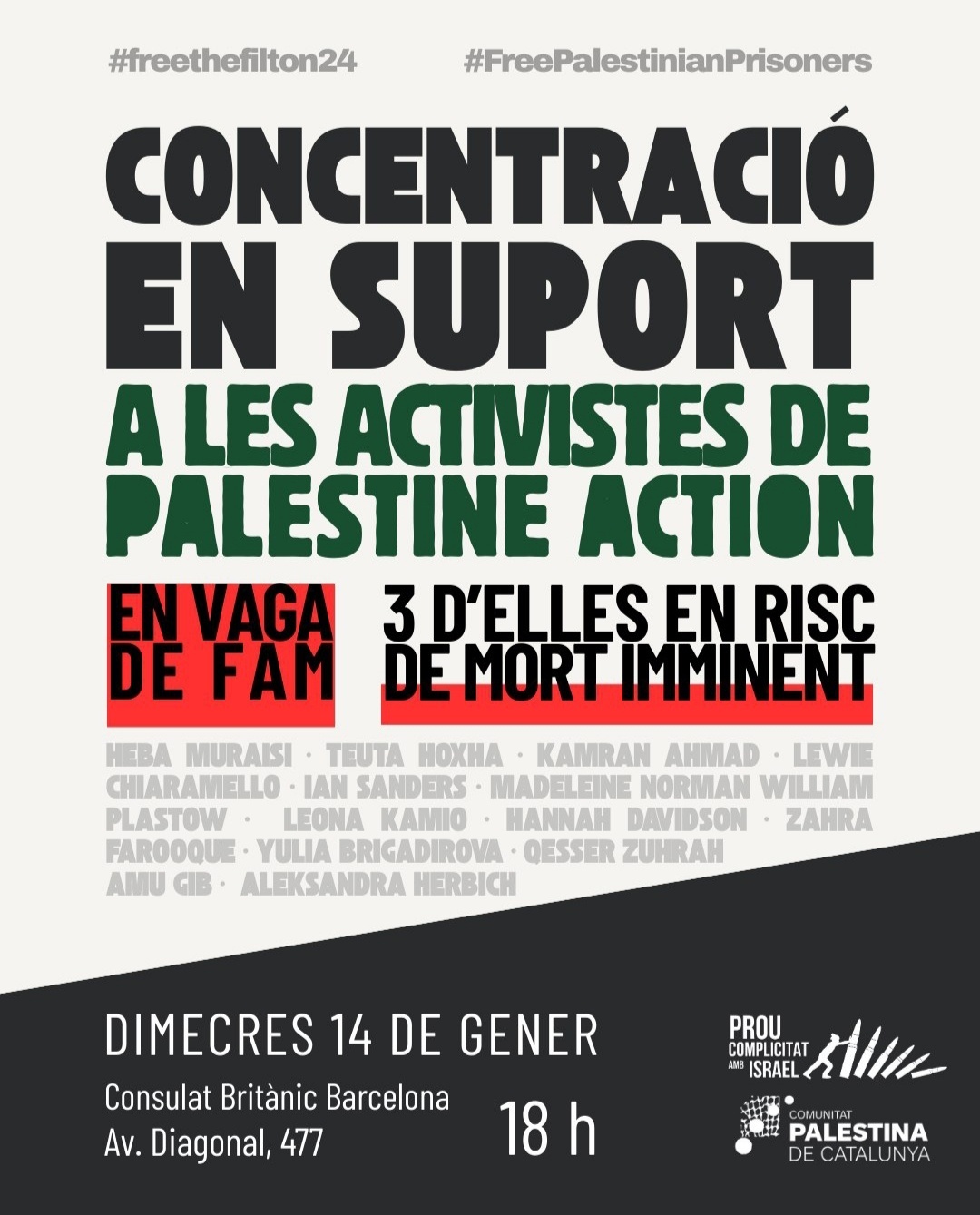 🇵🇸 Miércoles a las 18hs concentración frente al consulado británico en Barcelona en apoyo a l@s activistas de Palestine Action en huelga de hambre
