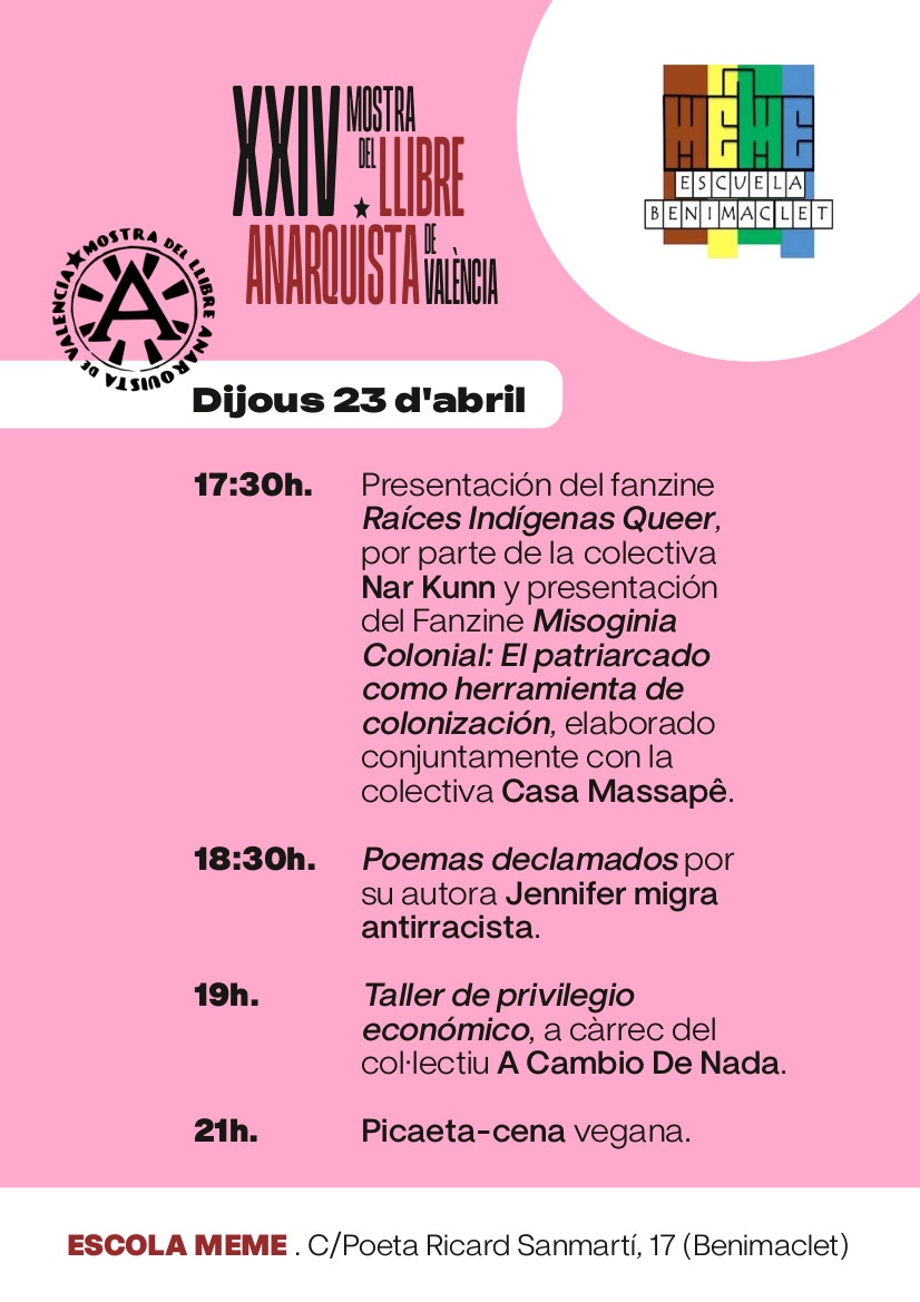 17:30: Presentación del fanzine Raíces Indígenas Queer, por parte de la colectiva Nar Kunn y presentación del Fanzine Misoginia Colonial: El patriarcado como herramienta de colonización, elaborado conjuntamente con la colectiva Casa Massapê.
