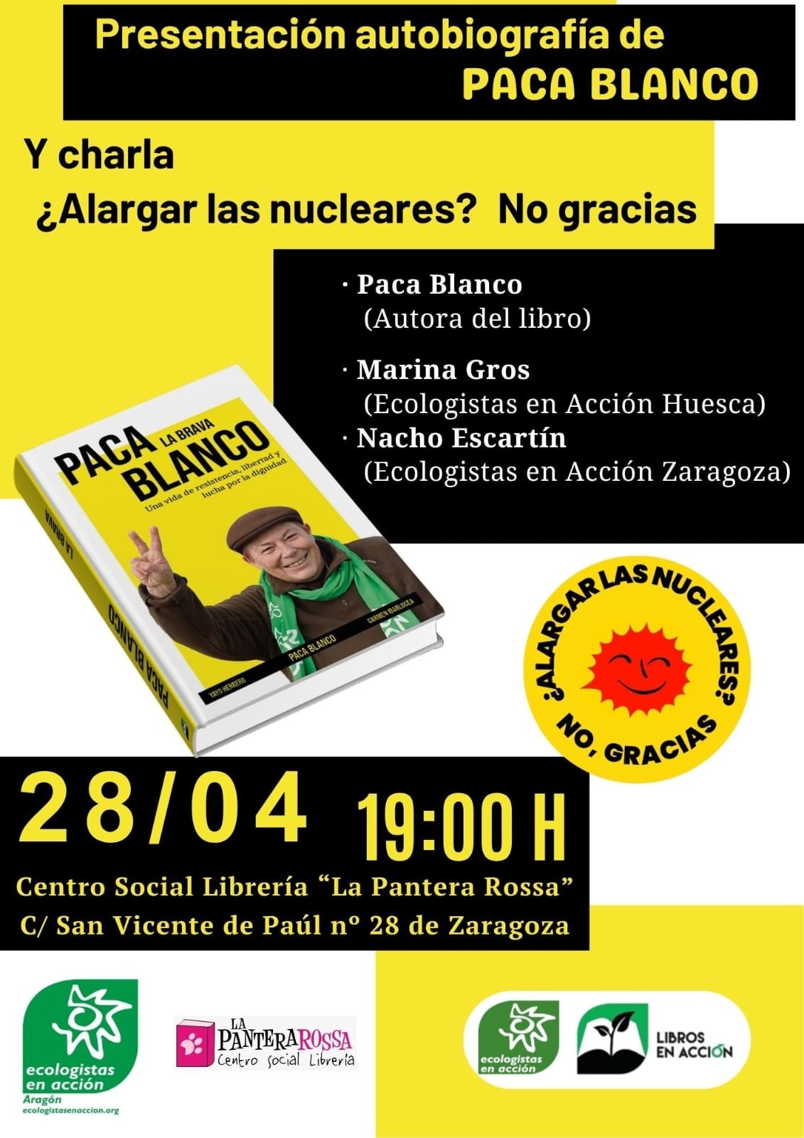 Presentación del libro "Paca Blanco, la brava" (Libros en Acción) y charla "Alargar las nucleares, no gracias", a cargo de la autora Paca Blanco, Marina Gros de Ecologistas en Acción-Huesca y Nacho Escartín de Ecologistas en Acción-Zaragoza, el martes 28 de abril, a partir de las 19.00 horas en La Pantera Rossa de Zaragoza (San Vicente de Paúl 28, local).