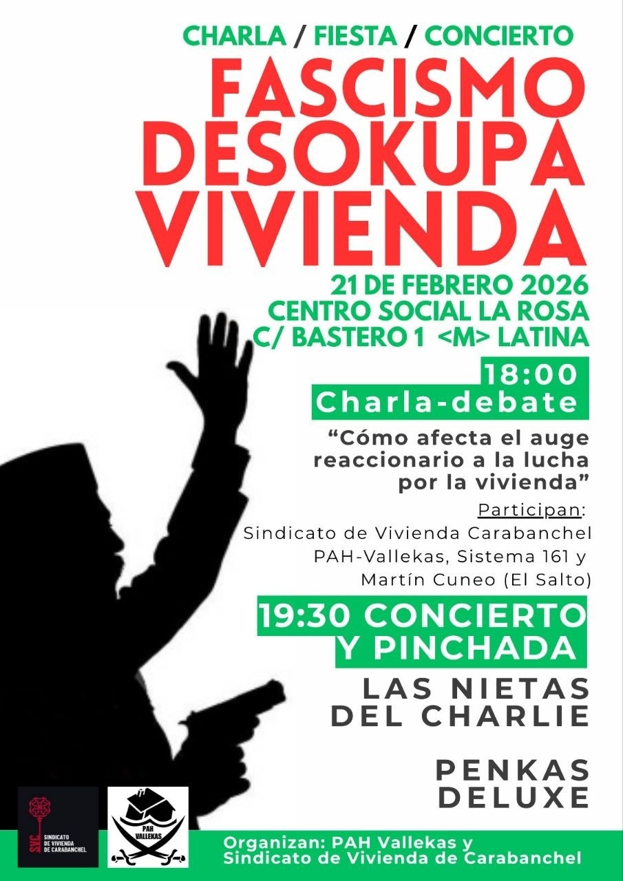 Jornada de charla sobre "Cómo afecta el auge reaccionario a la lucha por la vivienda", concierto de Las Nietas Del Charli y pinchada de Penkas Deluxe. Todo el dinero que se saque irá destinado a causas antirrepresivas por las multadas de las acciones derivadas del grupo de vivienda de Madrid en lucha contra Caixabank. Organizan PAH Vallekas y Sindicato de Vivienda de Carabanchel