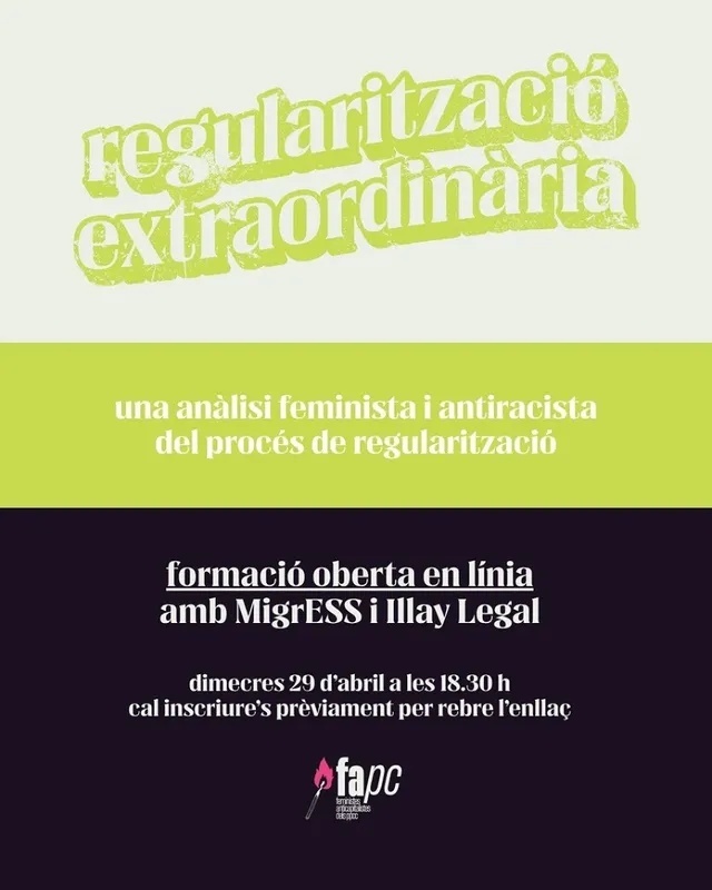 Com podem donar suport a la regularització extraordinària? Des de FAPC us convidem a la formació amb MigrESS i Illay Legal. Una anàlisi feminista i antiracista del procés de regularització i de les seves oportunitats i limitacions.