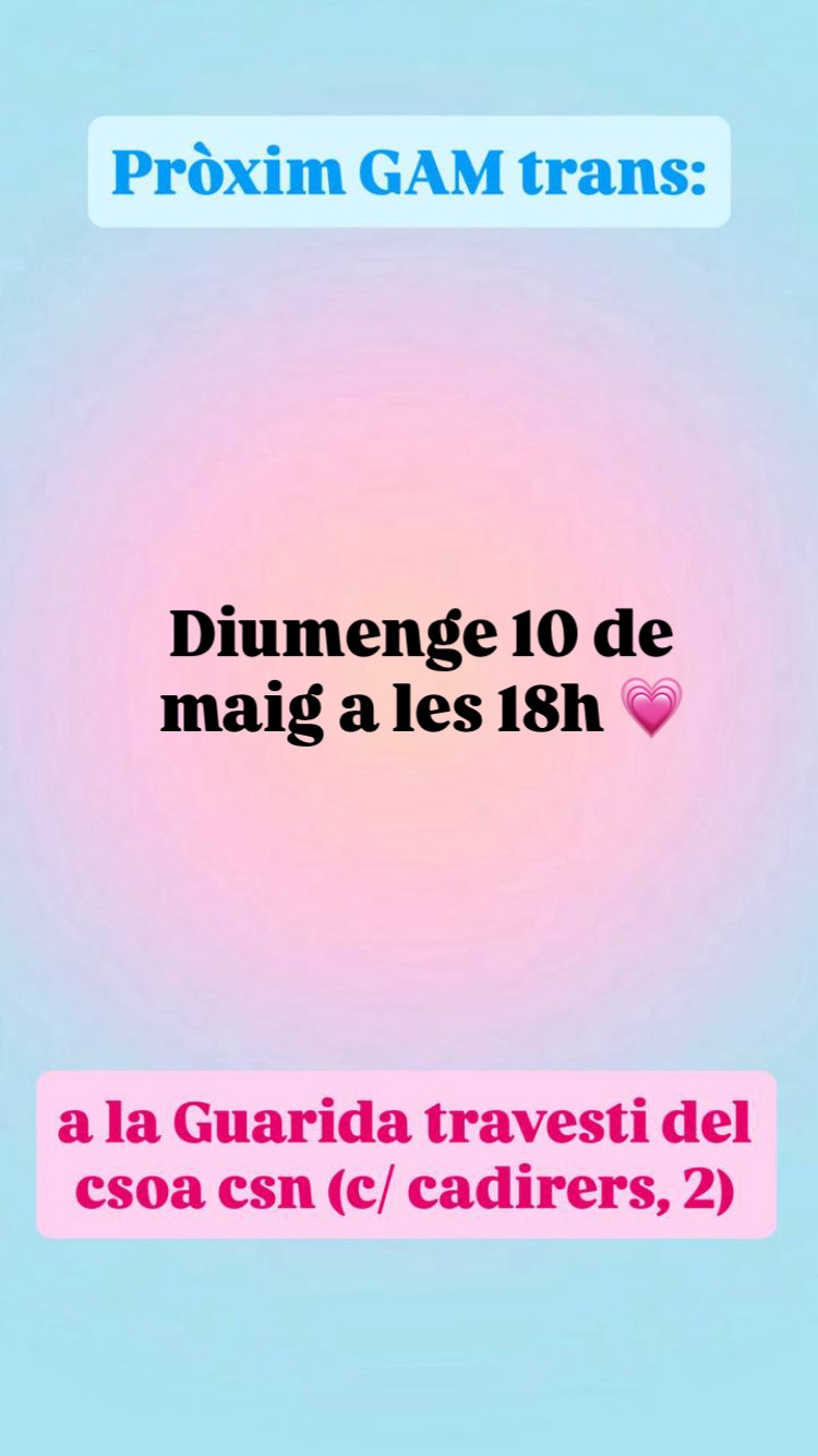 Ens reunim el diumenge 10 de maig a les 18h a la Guarida Travesti del CSN (carrer de Cadirers, 2, barri de Ciutat Vella, València)