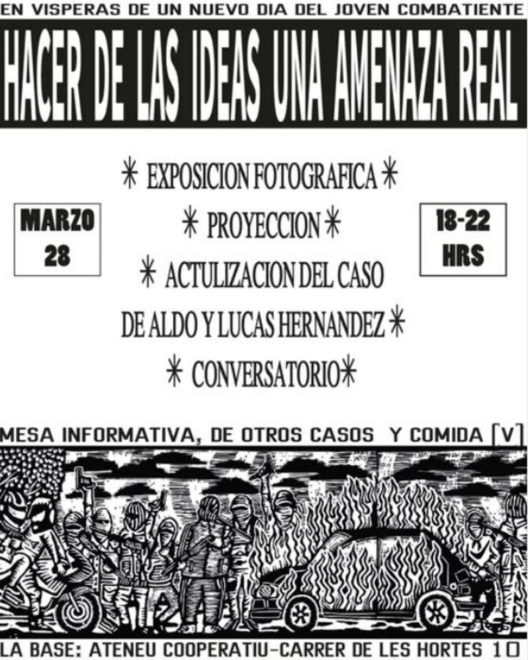 Aldo y Lucas se encuentran privados de libertad por acciones subversivas contra Gendarmería de Chile. Abrimos esta actividad dirigida tanto a recaudar aportes económicos para el sostenimiento jurídico y vital de este proceso que viven los compañeros, como para encontrarnos, compartir, (contra)informarnos del caso y reflexionar colectivamente acerca de la memoria combatiente y las prácticas subversivas del presente.