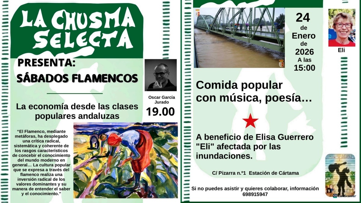 El sábado 24, va a ser una tarde noche de convivencia y solidaria empezamos a las 15:00 horas con una comida con música, actuaciones, poesía etc, para recaudar fondos para la compañera Eli que se le inundó la casa en las lluvias y continuaremos a las 19:00 horas con otro sábado flamenco con Óscar García Jurado que nos hablará de la economía desde las clases populares andaluzas en las letras del flamenco. Te esperamos tú ayuda es muy necesaria, entrará libre hasta completar aforo