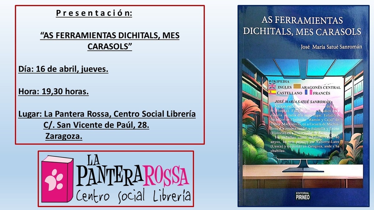 El jueves 16 de abril a las 19.30 horas en La Pantera Rossa de Zaragoza José María Satué Sanromán, natural de Escartín-Sobrepuerto, presenta su libro As ferramientas dichitals, mes carasols. Acompañará al autor L'Asociación Cultural Nogará – Religada, asociación comprometida con a luenga y cultura aragonesas.