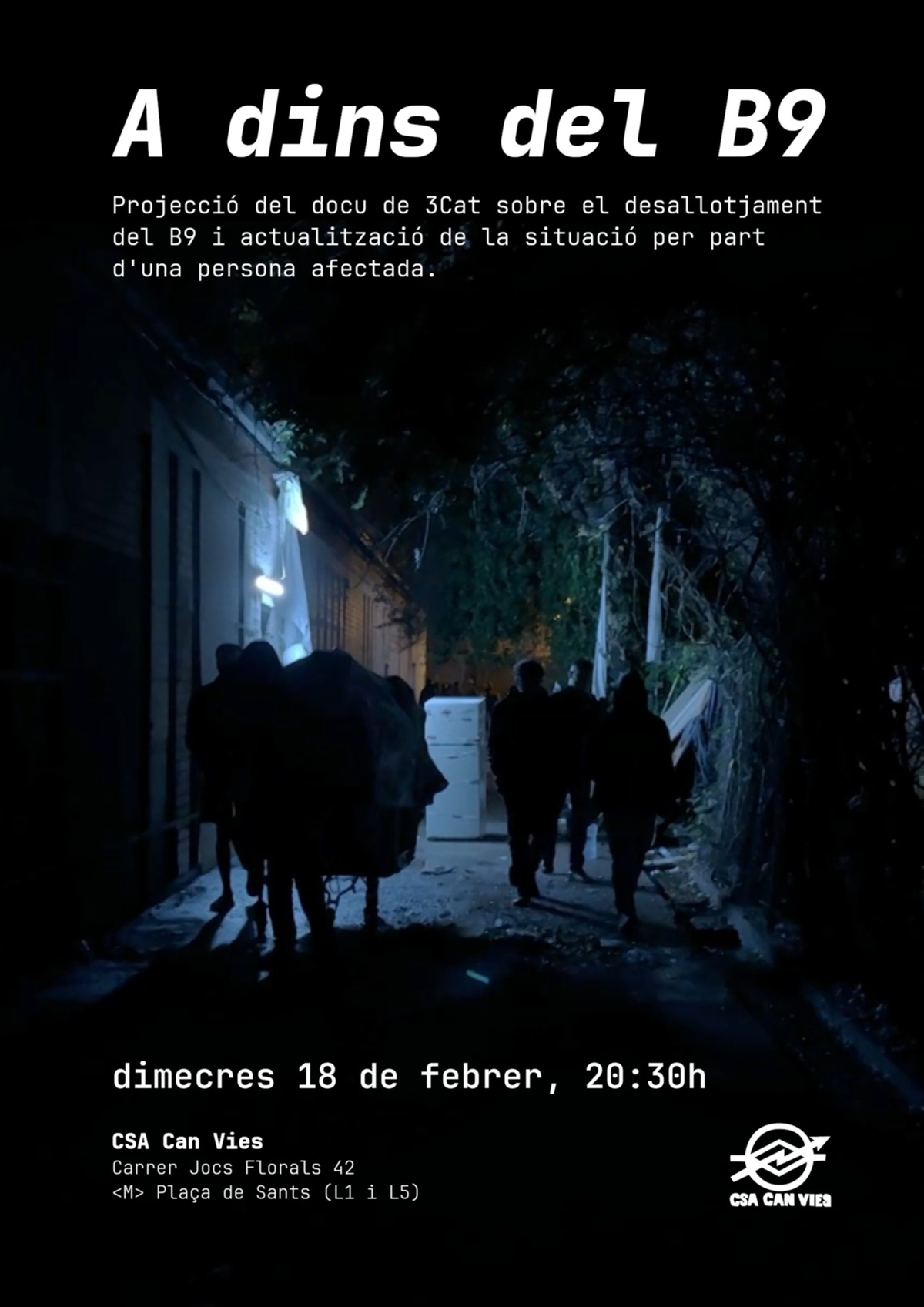 Projecció del documental de 3Cat sobre el desallotjament del B9 i actualització de la situació actual per part d'una persona afectada per aquest macrodesallotjament.