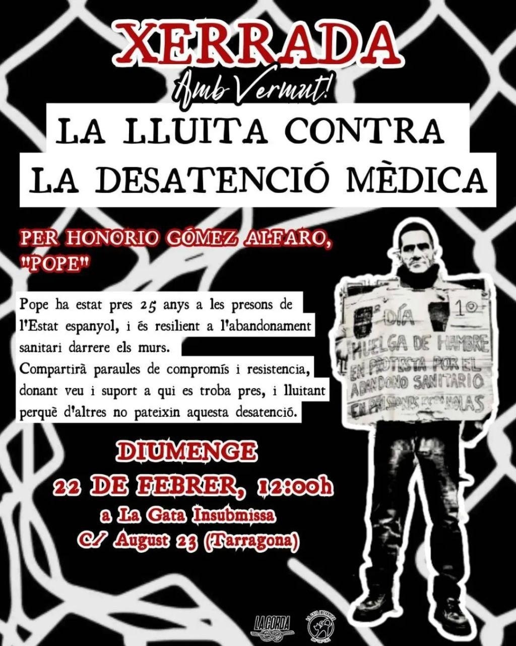 Xerrada a càrrec d'Honorio Gómez Alfaro, conegut com a Pope, parlarem amb ell i compartirà paraules de compromís i resistencia donan veu a les persones que es troben preses