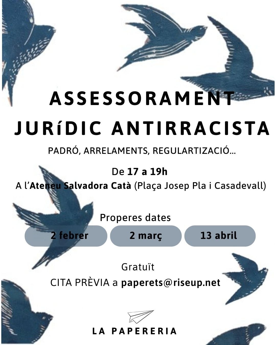 Col•lectiu autogestionat que ofereix assessoria jurídica i acompanyament en temes d'estrangeria respecte a tràmits de regulació de papers per arrelament, reagrupacions familiars, matrimoni/parelles de fet, renovacions, nacionalitat,etc. És un servei mensual gratuït i en formació constant!
