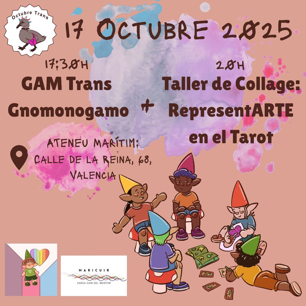 - 17:30 GAM Trans Gnomonogamo de @la_gran_gnomada no mixto (solo gente que no sea cis): En el Grupo de Apoyo Mutuo exploraremos juntes qué pasa y qué une a lo trans y lo no-monogamo.