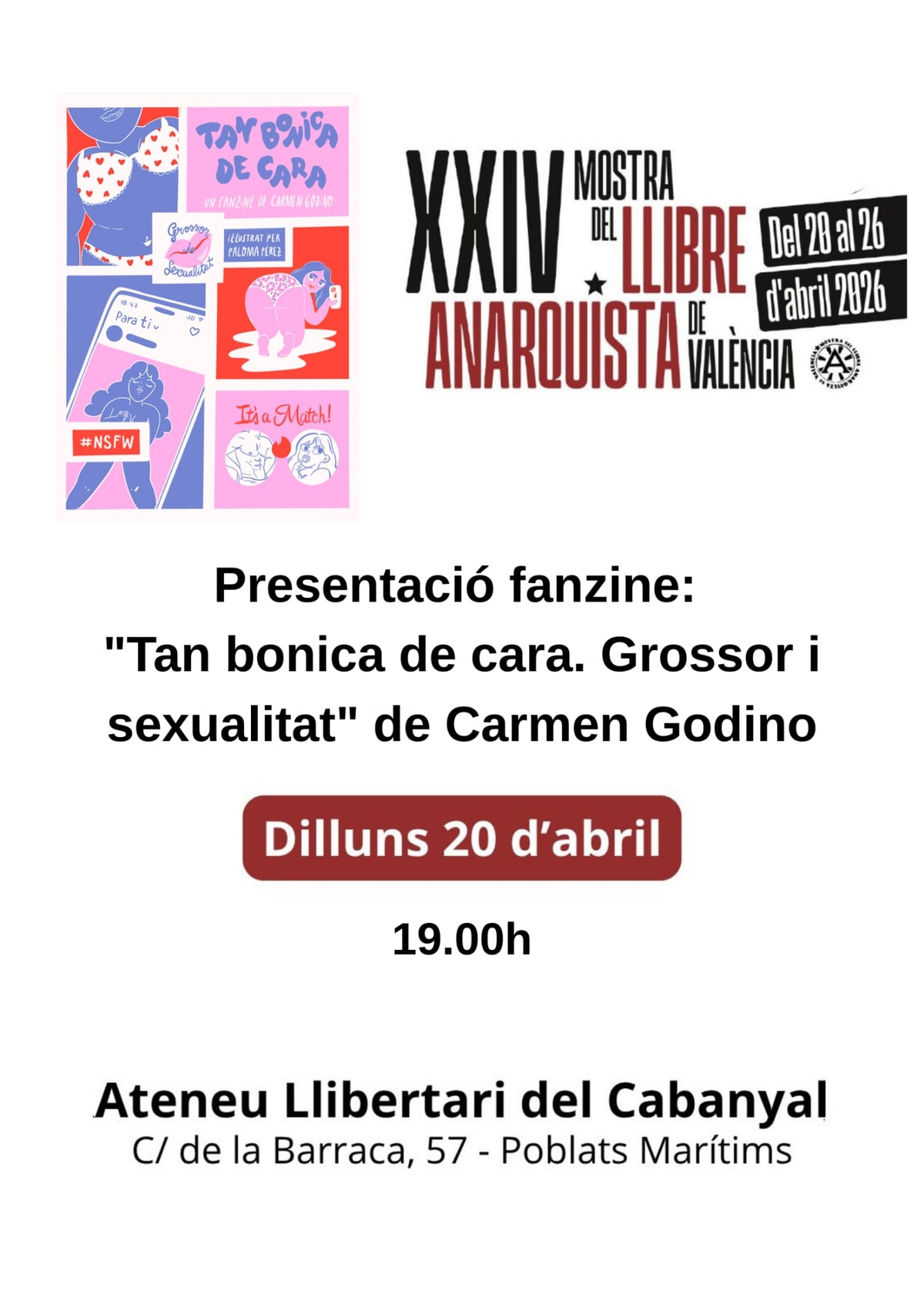 “Tan guapa de cara: gordura y sexualidad” es un fanzine que parte de la herida entorno a las relaciones sexo afectivas y el cuerpo gordo, pero que pretende ser más que la herida. Con ilustraciones de Paloma Pérez- ilustradora alicantina con diferentes trabajos entorno al cuerpo gordo y la crítica a la gordofobia- y textos de Carmen Godino- desde 2017 hablando sobre gordofobia y presión estetica-, además de un QR a la versión extensa del texto. El fanzine pretende reflexionar sobre el capital sexual, la gordofobia, la pornografía, el deseo, la seducción, la agencia sobre el propio cuerpo, entre otros. El fanzine, ha sido presentado en Castellón, Alicante y Valencia y repite con este acto. A esperas de poder presentarlo en Bilbao, Madrid y Barcelona. Por último, podéis disfrutar de “Tan guapa de cara” en castellano y en valenciano.