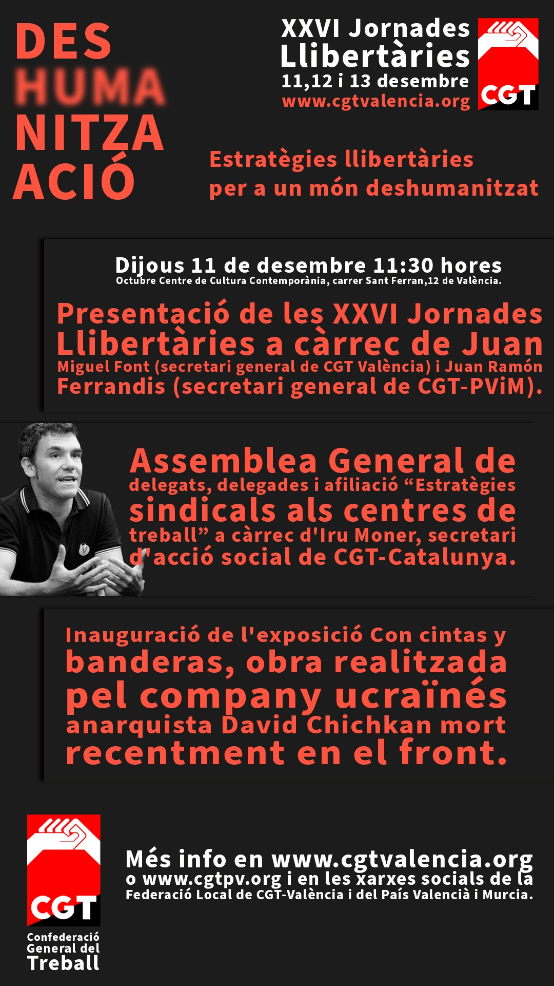 Por la presente, convocamos a todos los delegados, delegadas, afiliados, afiliadas y simpatizantes a la próxima Asamblea General de CGT-València y que servirá también, como presentación de las XXVI Jornadas Libertarias. La convocatoria se celebrará el jueves 11 de diciembre a las 11:30 de la mañana en el “Octubre Centre de Cultura Contemporània” situado en la Calle de Sant Ferran, 12 de València.