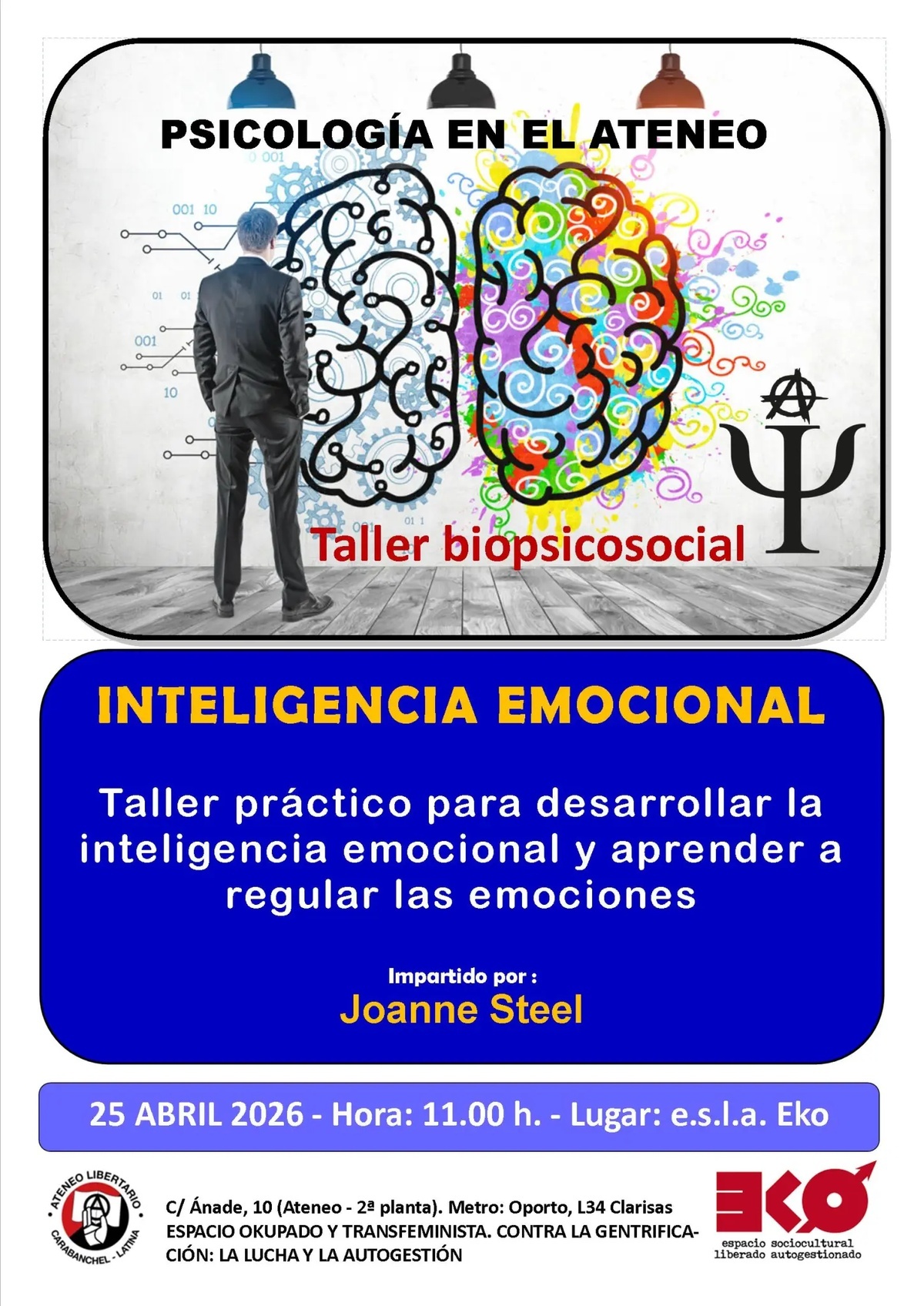 Folleto: https://ateneolibertariocarabanchellatina.wordpress.com/2026/04/14/psicologia-en-el-ateneo-inteligencia-emocional-taller-practico-25-de-abril-2026-sabado-11-h-en-el-eko-organiza-el-ateneo-libertario-carabanchel-latina/