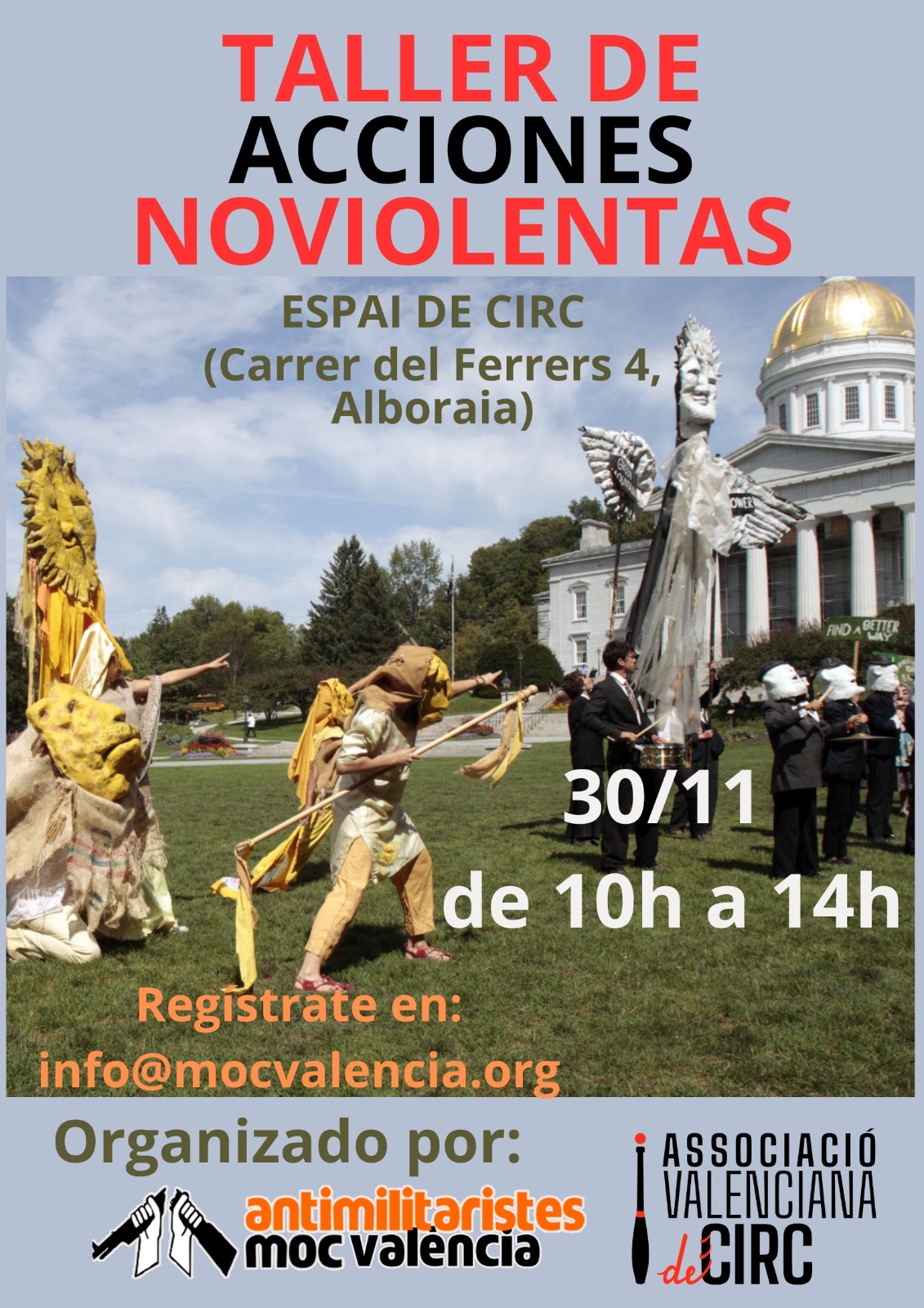 Juntem l'Associació Valenciana de Circ amb el MOC per a investigar eines pràctiques i estratègies per a planificar i realitzar accions noviolentes i intervencions a l'espai públic. Parlarem de la història de la noviolència i l'antimilitarisme i aprendrem a preparar accions i intervencions segures i creatives amb dinàmiques pràctiques, amb les quals posarem el focus en estratègies comunicatives de desescalació. També parlarem dels nostres drets segons les lleis vigents, la "llei mordassa" i maneres de comunicar amb la policia i autoritats.