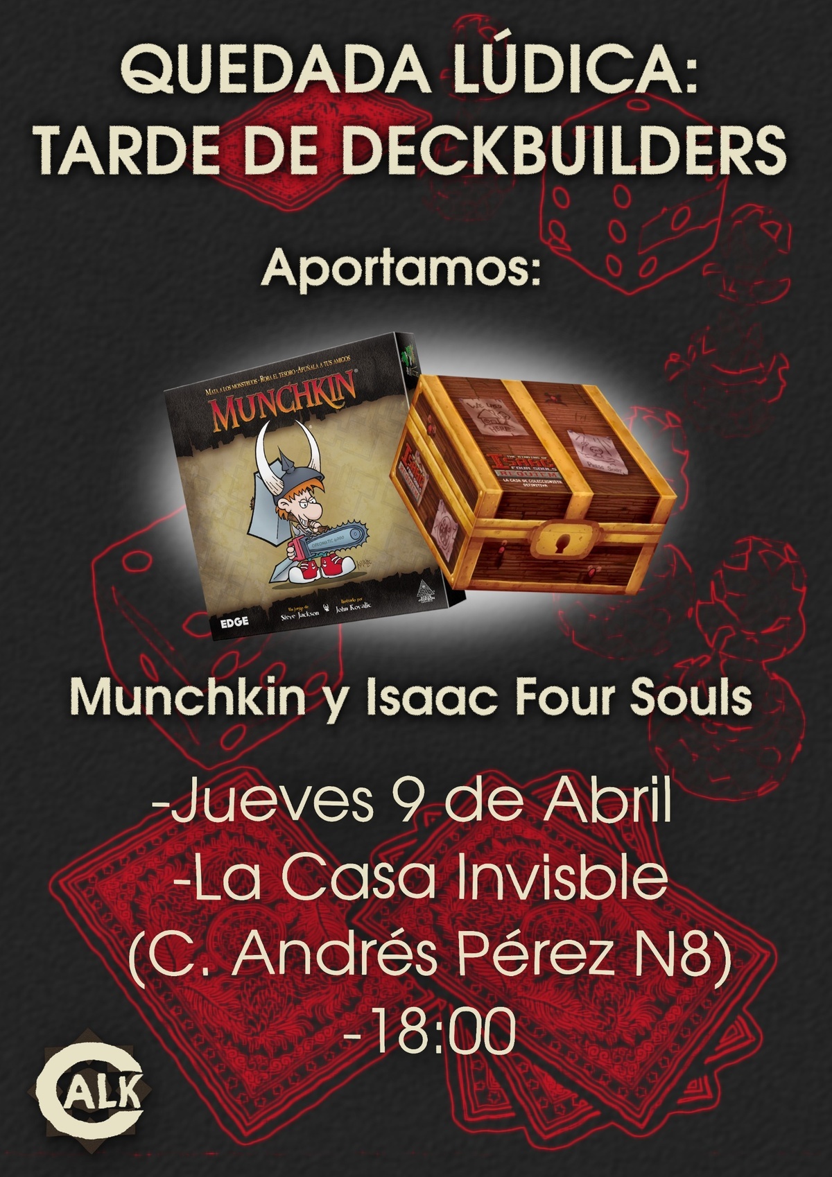 Nos Vemos este Jueves 9 en la invi para jugar Deckbuilders. Desde el colectivo aportamos Munchkin y Isaac Four Souls, pero, ¡Si tienes algún deckbuilder (o juego de mesa en general) que quieras traerte no dudes en hacerlo!