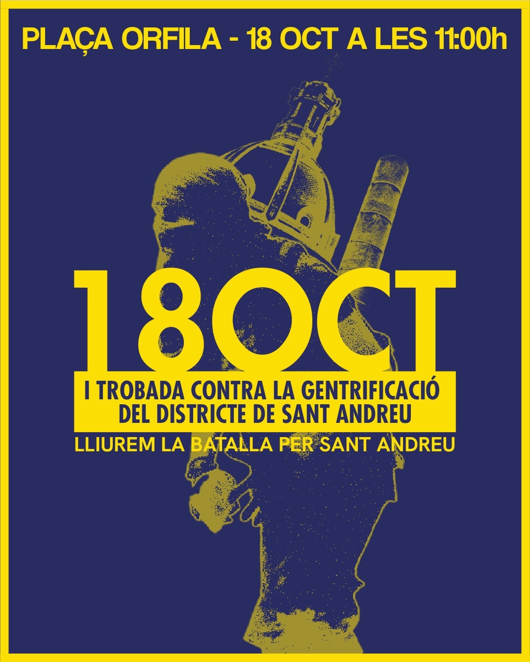 El proper dissabte 18 d'octubre a les 11h ens trobem a Plaça Orfila per teixir aliances entre els col·lectius i veïnes de Sant Andreu. Juntes fem front al procés de gentrificació que estem vivint al barri i els efectes que aquest té sobre les nostres vides.